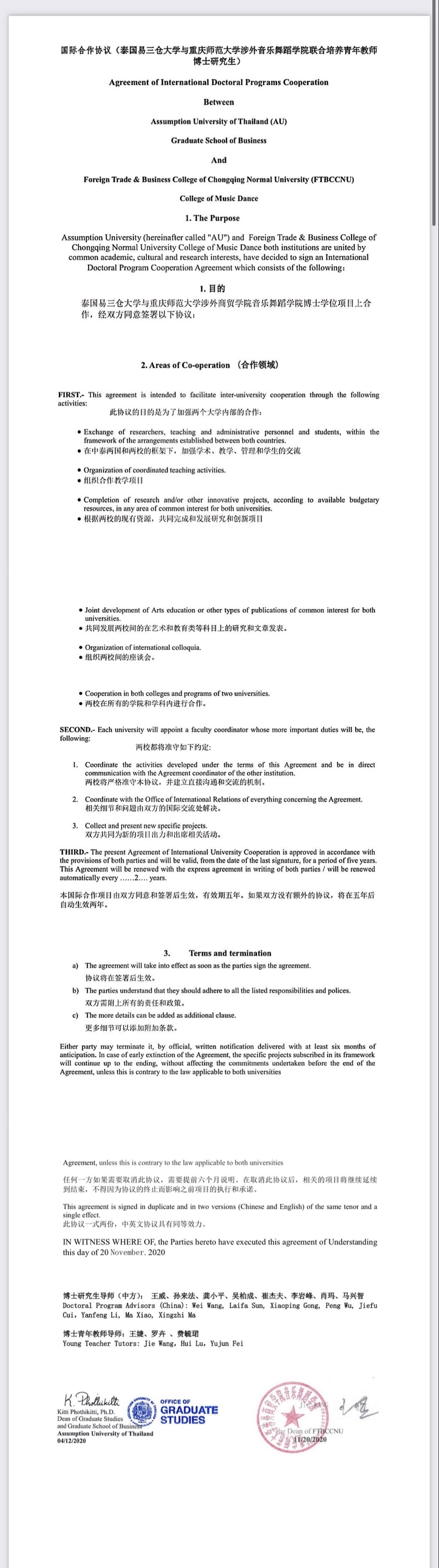 泰国易三仓大学研究生院院长Kitti博士,重庆师范大学涉外音乐舞蹈学院院长王婕作为代表签署了合作协议。泰方驻华代表范进超博士,泰国易三仓大学在读博士代表潮阳共同出席了线上签约仪式。