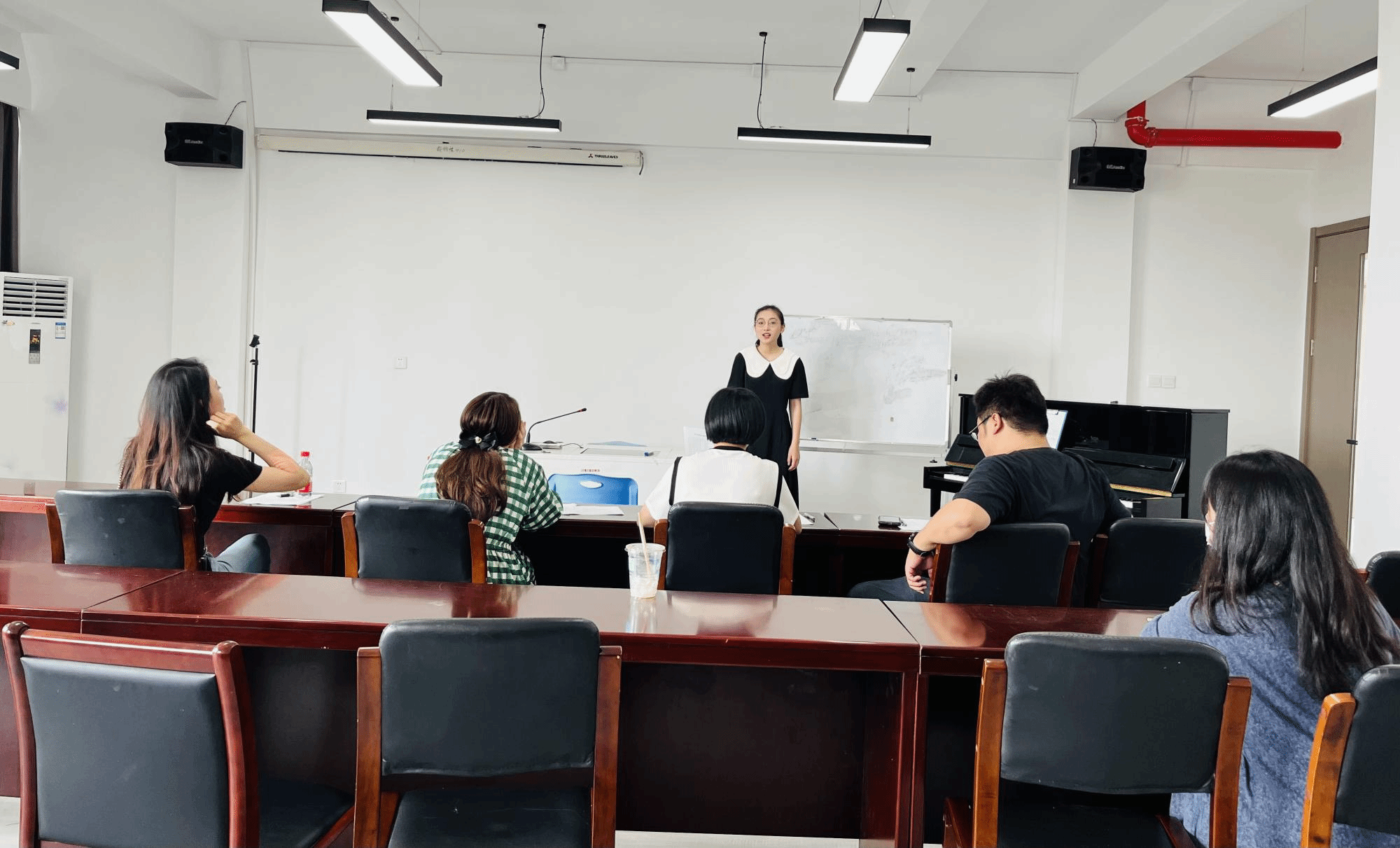 本次竞赛的流程严格按照浙江省师范生技能大赛规程操作,选手根据抽取的题目进行一课时的教学设计,选取核心内容进行8分钟模拟上课及板书设计,评委根据选手的教学设计、教学仪态、模拟上课表现、板书、弹唱能力等提出问题和教学建议,并现场打分。在所有选手都展示结束后,评委老师们充分肯定选手的优点,也对选手的不足之处提出指导和建议。最后,最终入围校决赛的分别是仇梦娜、杨一涛、黄祺茜、张欣然、钟欣怡五位同学。