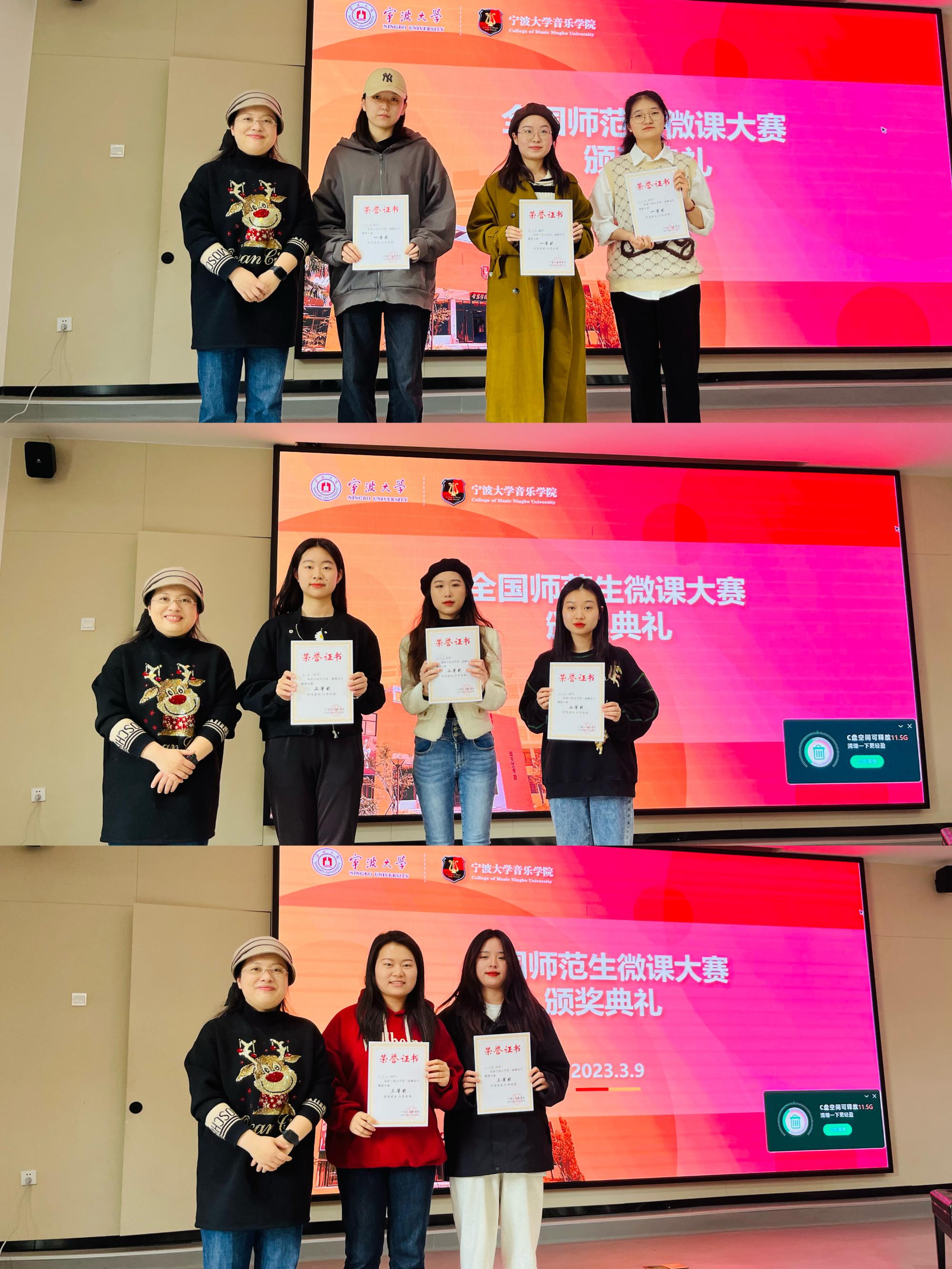 在逸夫音乐楼一楼报告厅举行了全国师范生微课大赛颁奖典礼。副院长王蕾宣读了院级、校级、国家级获奖学生名单,并为获奖学生颁发荣誉证书。