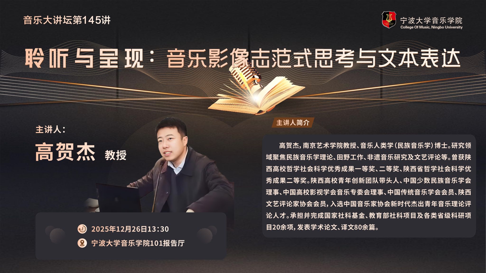 成功举办。本次分享会由高贺杰教授主讲,深入剖析了音乐影像志这一兼具学术性与艺术性的领域,系统梳理其发展脉络、多元范式,并通过经典个案解读为在场学生带来了一场关于声音与影像的深度思想碰撞。