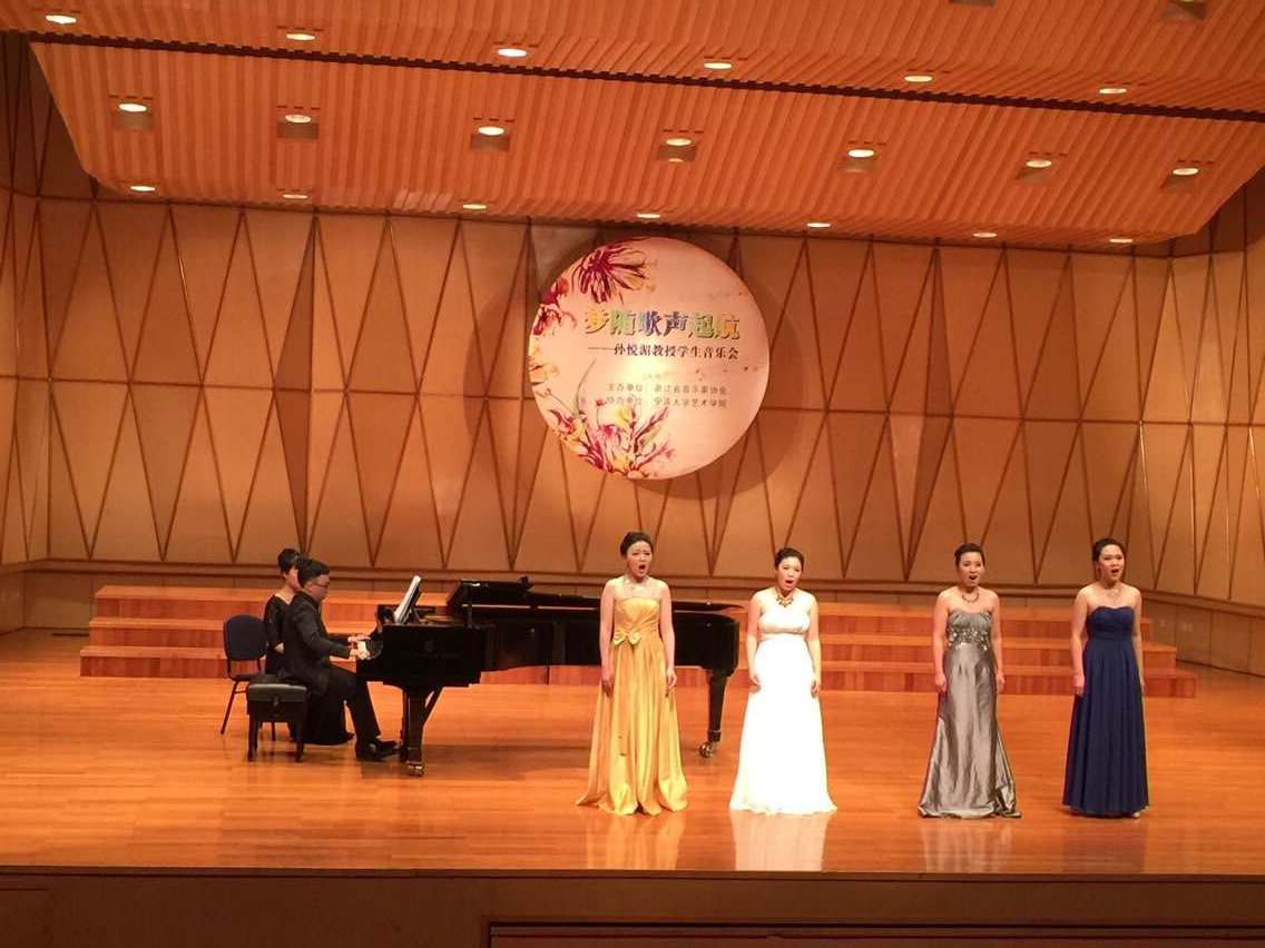 演唱结束后,孙悦湄教授发表了一番感言。她首先回顾了自己从教三十多年来所走过的一段不平凡的艺术求索之路,总结了自己的声乐教学经验,并对来到现场聆听音乐会的各界友人表示衷心的感谢。接着,她感谢音乐会的艺术指导孙铭澧博士和参演学生的无私奉献和辛勤付出,没有他们的努力,也不会有今天音乐会的成功。孙教授还表示在这场音乐会的演员中,王慧漪、孙杰瑾、叶文佩、李奇倬等四位同学是今年即将毕业的本科生,共同经历了四年的人生风雨,在这即将告别的时刻,她作为这四位学生的师长和朋友,祝福她们在未来的人生旅途和艺术道路上“梦随歌声起航”,用音乐诠释自己心中的中国梦,砥砺前行,同心筑梦,在实现中华民族伟大复兴的伟大实践中用青春谱写属于自己的灿烂乐章。