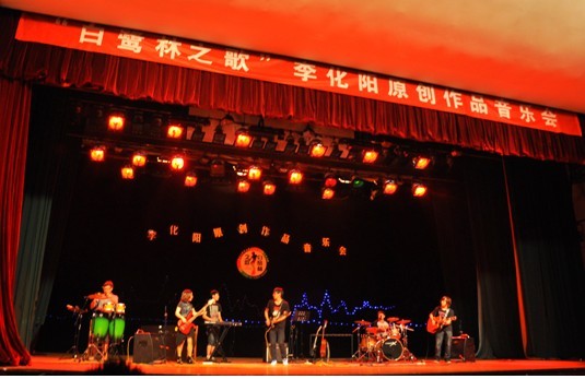 5月26日晚,“白鹭林之歌”——李化阳原创作品音乐会在林杏琴会堂举行。此次活动吸引了全校师生的关注,现场反响热烈。此次演出的乐队名为“载物乐队”,即承载梦想的乐队,其成员包括队长李化阳、鼓手林喆、贝斯尹靖、吉他手王原野以及键盘手袁金宝。