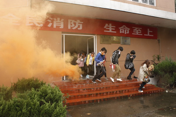 中午12:45,演练正式开始。只见厚德楼前浓烟滚滚,楼道内烟雾弥漫。学院立即启动应急疏散预案,参加演练的大一新生在疏导员的指引下,用湿毛巾捂住口鼻弯腰前行,有秩序地从楼梯往下撤离。经过紧急疏散,所有参演学生都撤离到了安全地带,演练画上了圆满的句号。
