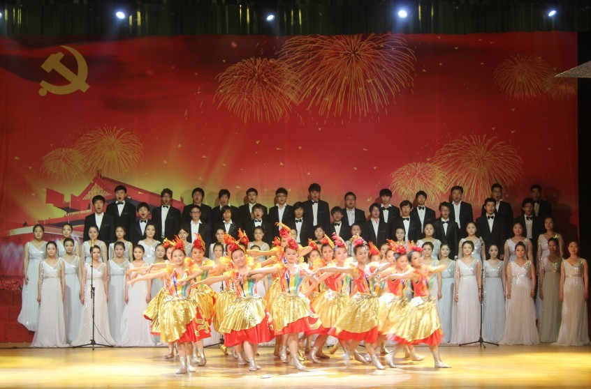 舞蹈《苦难的岁月》拉开了演出的序幕。男生小组唱《码头工人歌》和男女声二重唱《松花江上》描绘了劳苦大众在三重大山压迫下的悲惨生活和国家陷入内忧外患的严峻局势;小合唱《过雪山草地》描写了中国工农红军翻越雪山、穿过草地的惊世壮举,表现了共产党人的革命乐观主义精神和坚定的共产主义信念;大型舞蹈《一条大河》表达了中国共产党领导下的人民军队为保卫祖国、保卫和平而甘愿献出生命的崇高情怀;歌曲联唱《北京欢迎你》表现了在中国共产党的领导下,中华民族日益昌盛、人民幸福安康的美好景象;在大合唱《在灿烂的阳光下》的音乐和舞蹈中,演出圆满落下帷幕。整个演出气势磅礴、恢弘有力、高潮迭起,博得现场观众的阵阵掌声与欢呼声。