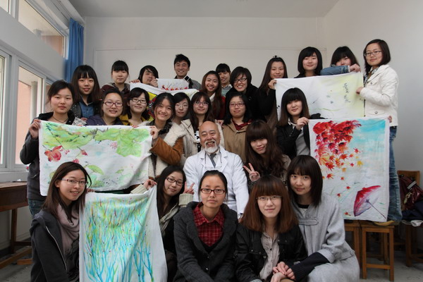 08级服装设计方向的学生上了一堂“织物的染绘技法”课。课上斋藤教授对当前日本前沿的纺织染料着色剂的使用方法进行了说明和检验。授课中斋藤光弥教授还进行了具体示范,并和同学们分组完成了一件作品。