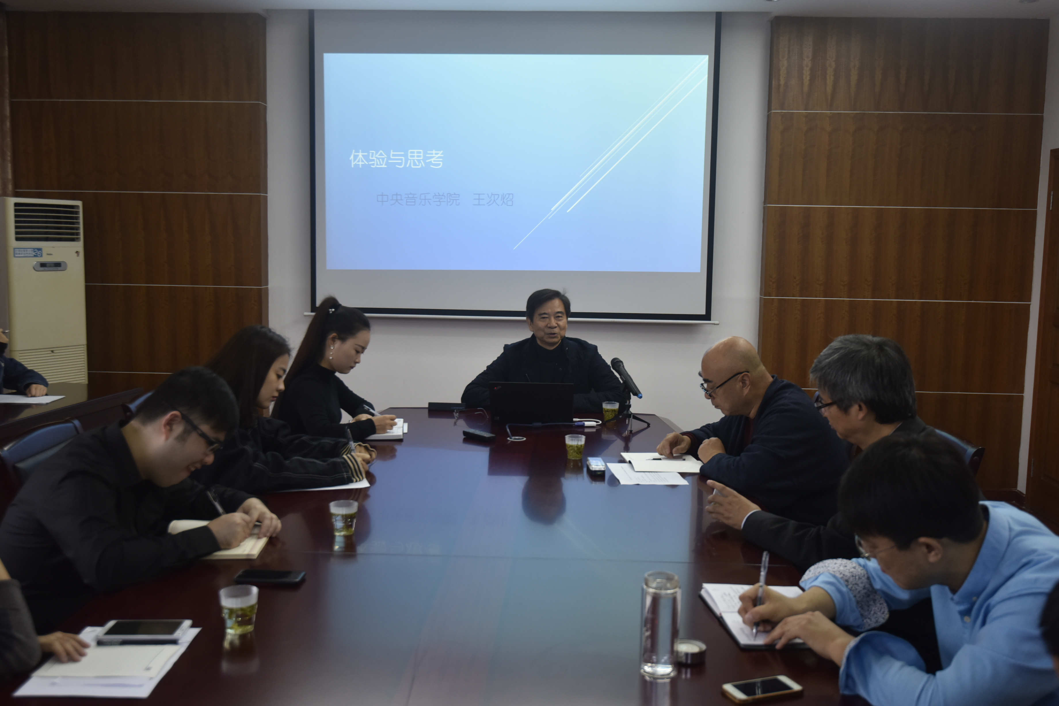 院长俞子正教授、王自东教授、杨红光副教授、学院各教研室老师代表,以及本科和研究生学生代表等。此次讲座主要内容分为六个部分:第一,课堂体验与思考;第二,讲座体验与思考;第三,阅读体验与思考;第四,音乐会的体验与思考;第五,环境体验引发的思考;第六,交往体验引发的思考。在整个讲座过程中,王次炤教授以自身的人生经验体会为例,逐条展开讲解,内容生动丰富,引人深思。在讲座结尾处,王次炤教授提出:体验与思考相结合,才能引发学术研究的新思路;没有思考的体验无法向学术高度迈进,没有体验的思考会失去学术研究的生命力。院长俞子正教授做最后总结并以此指导和勉励在场教师和同学们,在音乐研究和学术道路上不断思考进取,向更高更深程度迈进。