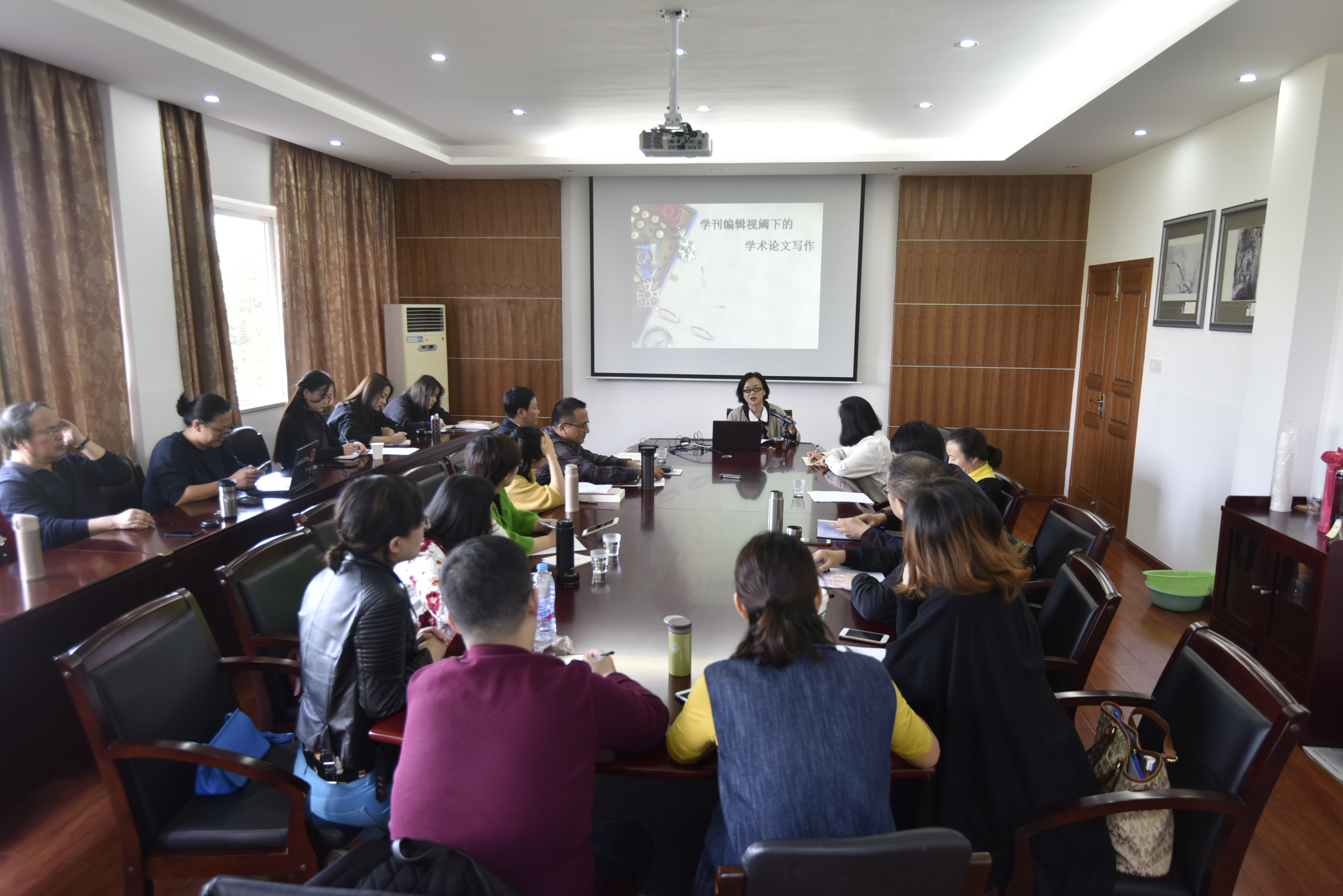 老师和同学们作了一场题为《学刊编辑视阈下的学术论文写作》的精彩讲座。参加此次讲座的人员有学院各教研室老师代表,以及硕士研究生学生代表等。此次讲座内容主要分为五个部分:第一,学术论文的内涵;第二,论文选题的技巧;第三,论文题目的表达;第四,论文撰写中的规范性;第五,学术规范的问题。在整个讲座过程中,周密老师总结了自身的工作经验,详细地讲解了学术论文写作中会遇到的问题,并通过生动丰富的示例,给老师和同学们带来论文写作方面的灵感和启发。最后,周密老师以自己的一席寄语送给老师和同学们,鼓励老师和同学们通过不断的练习提高写作水平,写作不仅仅是过程的辛苦,更多的是成功的喜悦和思考的乐趣,还有无法用语言表达的工作激情。