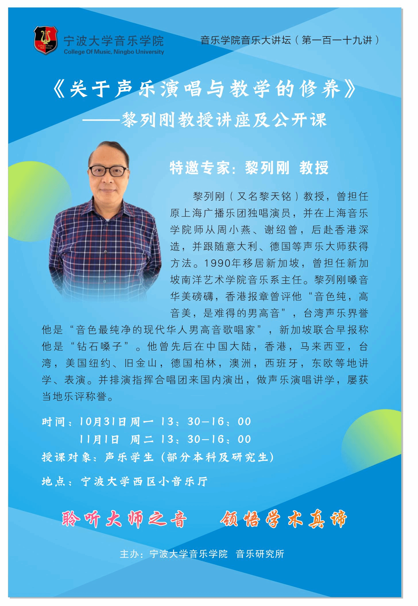 进行了题为《关于声乐演唱与教学的修养》的学术讲座。讲座内容从“咬字要规范、把歌唱气息变成平时生活的常态、把高位置的发声作为生活的常态、关于歌唱的意境”四个方面与师生们分享了自己的艺术实践与理论所获,并于师生们进行了问答的互动交流。公开课环节中,黎教授耐心细致地对四位本科、四位研究生从歌唱语言、发声技巧、艺术表达等方面进行了悉心指导。