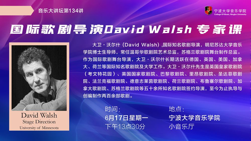 主讲人简介:大卫·沃尔什 (David Walsh) ,国际知名歌剧导演,明尼苏达大学喜漫漫画