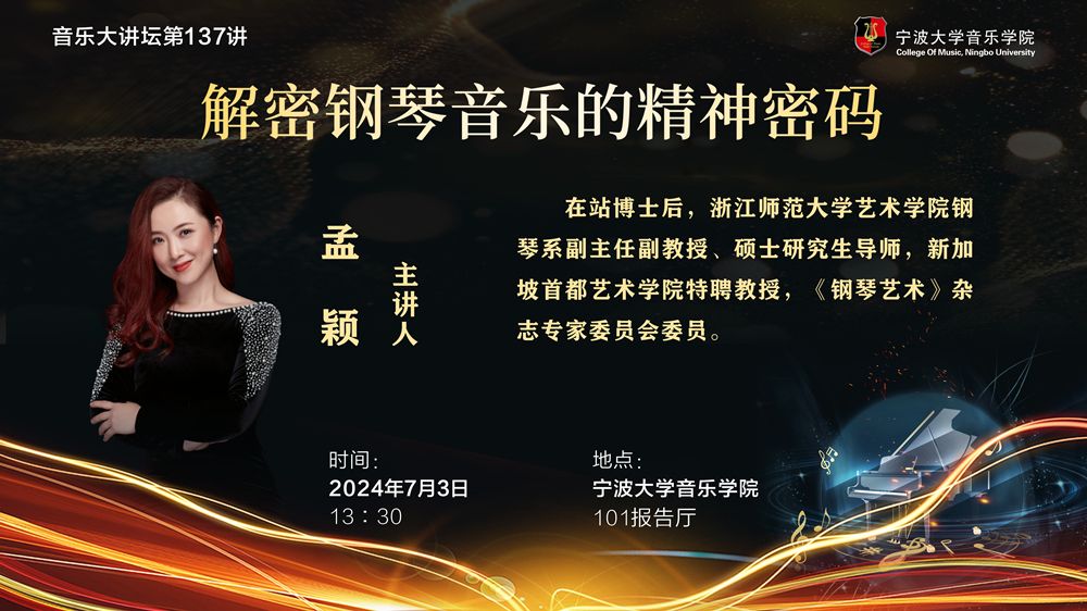 主讲人:孟颖,在站博士后,浙江师范大学艺术学院钢琴系副主任副教授、硕士研究生导师,新加坡首都艺术学院特聘教授,《钢琴艺术》杂志专家委员会委员。