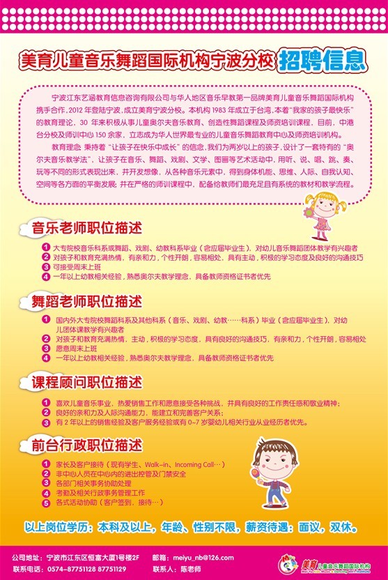 【招聘】美育儿童音乐舞蹈国际机构宁波分校招聘信息
