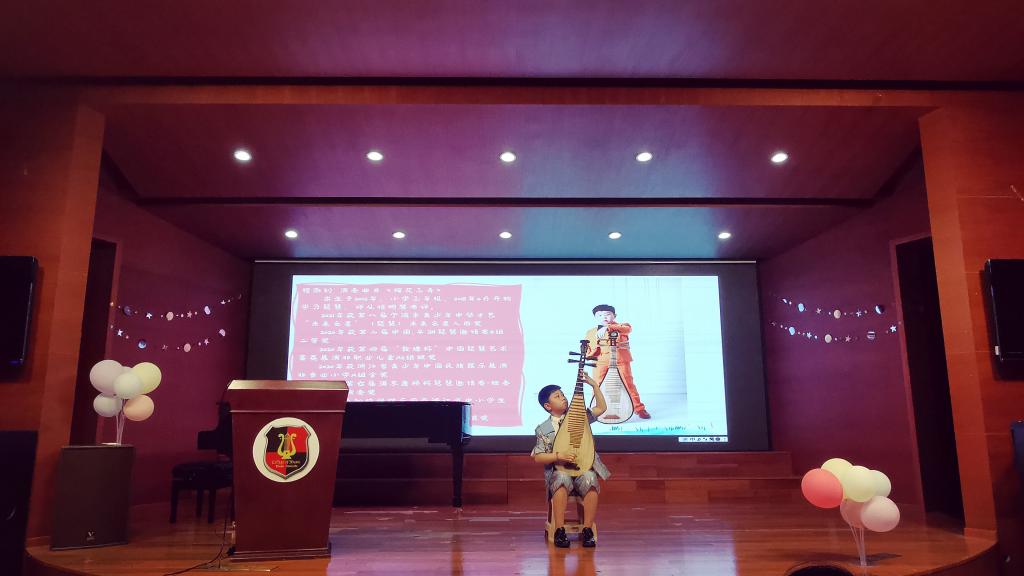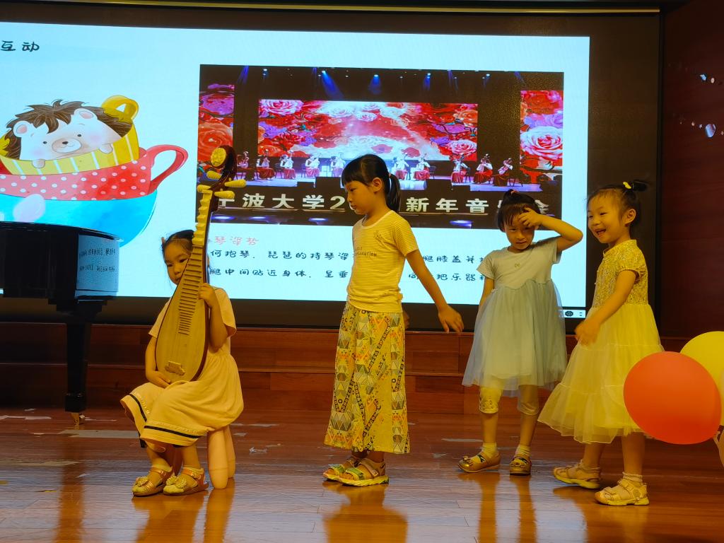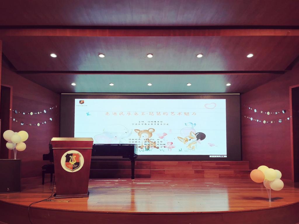 的琵琶专业教师,青年琵琶演奏家徐明慧老师主讲。徐明慧老师首先邀请小朋友们一起来学习并认识琵琶的构造,通过提问抢答的方式让大家对琵琶有了初步的了解;接着让小朋友们排队上台展示自己正确而优雅的琵琶弹奏的坐姿;最后,由徐明慧老师的4位琵琶学习者现场演奏曲目,现场的小朋友们跟随着悠扬的琵琶声感受民乐之王的艺术魅力,徐明慧老师和学生一起演奏的《送你一朵玫瑰花》将活动推向了高潮,现场的家长和小朋友们被民乐之王的悠扬声彻底征服了。