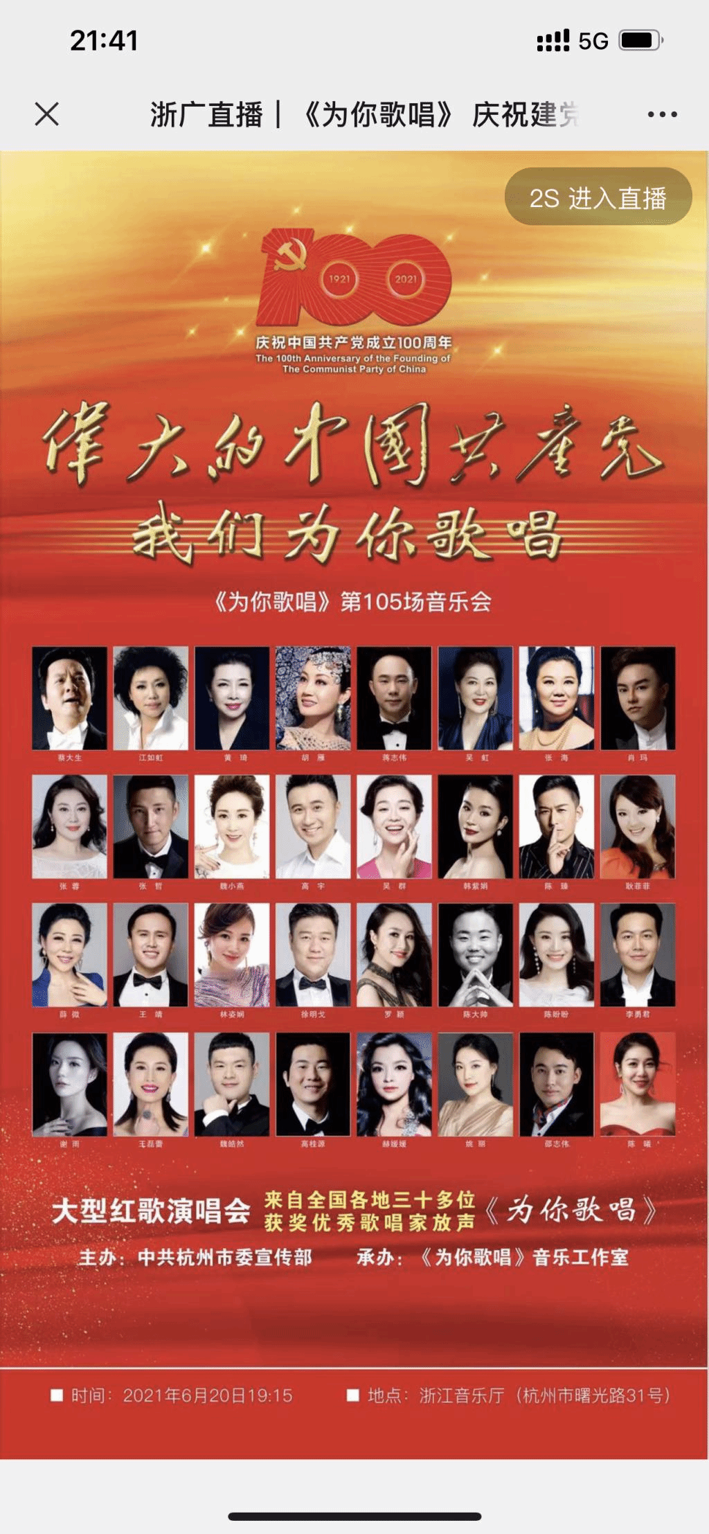 6月20日晚7:15,浙江音乐厅座无虚席,有杭州市委宣传部主办、“为你歌唱”音乐工作室承办的“为你歌唱”第105期“纪念伟大的中国共产党诞辰100周年”大型红歌演唱会准时开幕。喜漫漫画